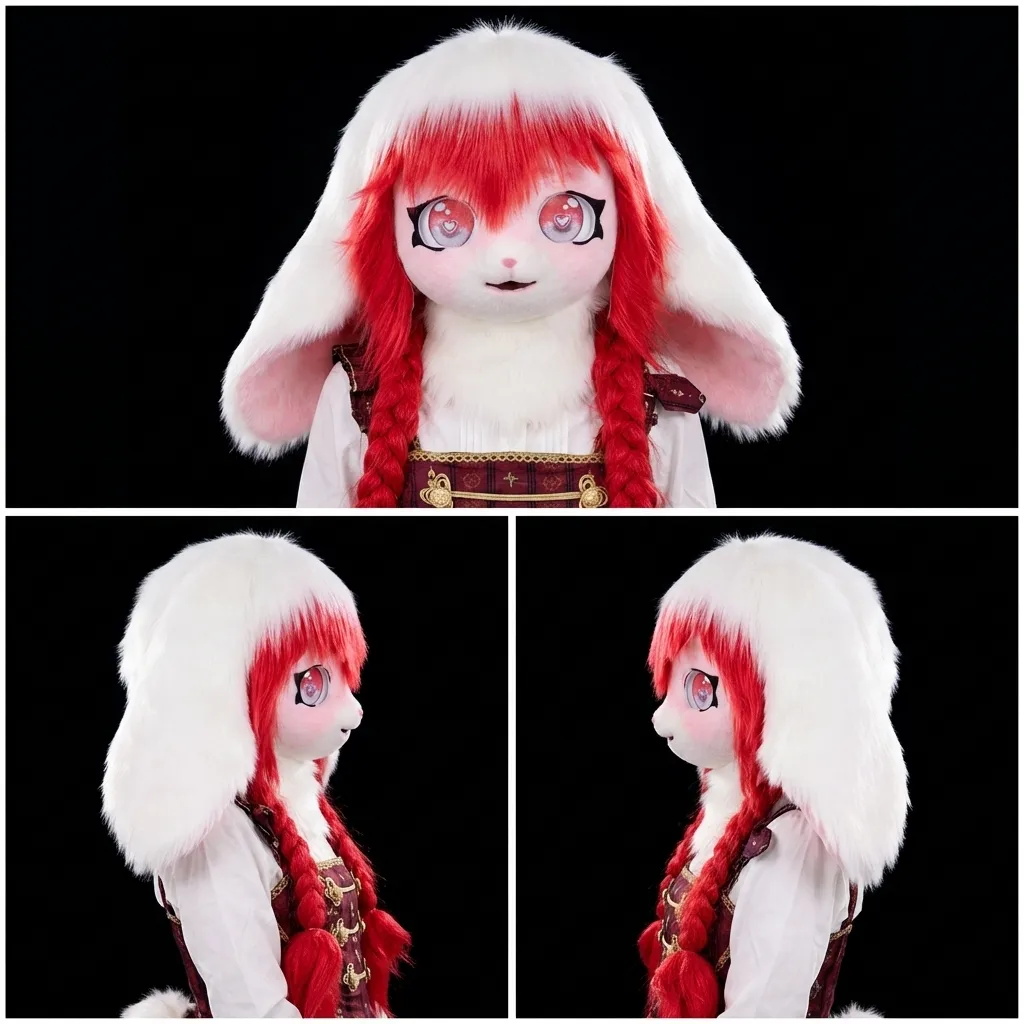 Featuring vibrant red braided hair, soft white faux fur, oversized anime-style eyes, and long floppy ears, this fursuit includes paw gloves and a fluffy tail. Comfortable for long wear and perfect for cosplay and creative content.